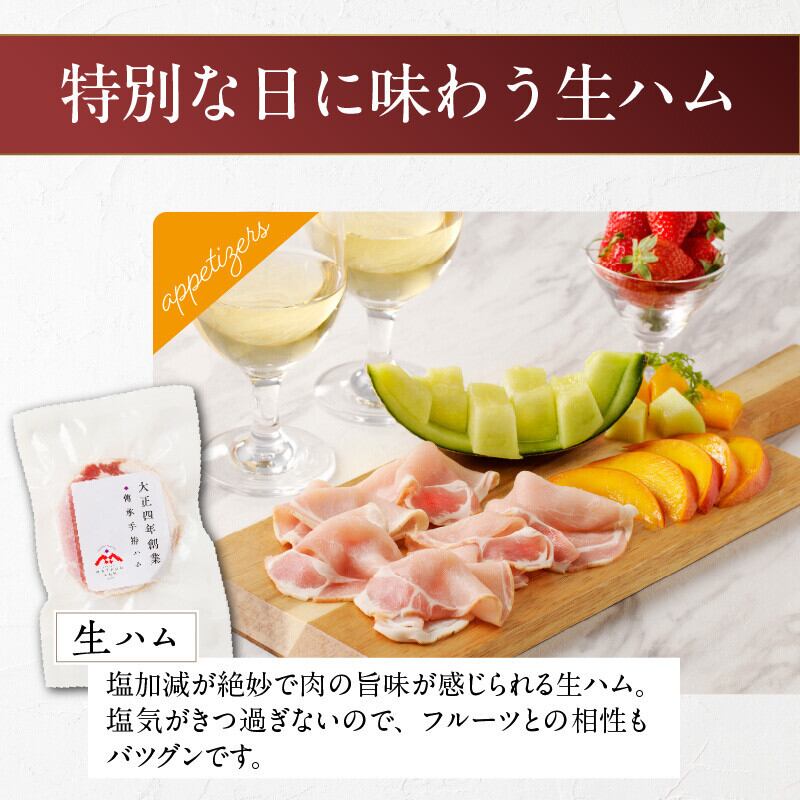特別なシーンを演出する贈り物に最適な松尾ハム Eセットは、ドイツ式生ハム(ラックスハム)を詰め込んだ逸品です。長時間の塩水熟成と低温燻製により、深い旨味と程よい塩味が絶妙に調和しています。大切な方へのギフトとして、またご自宅の特別なひとときにもぴったりです。